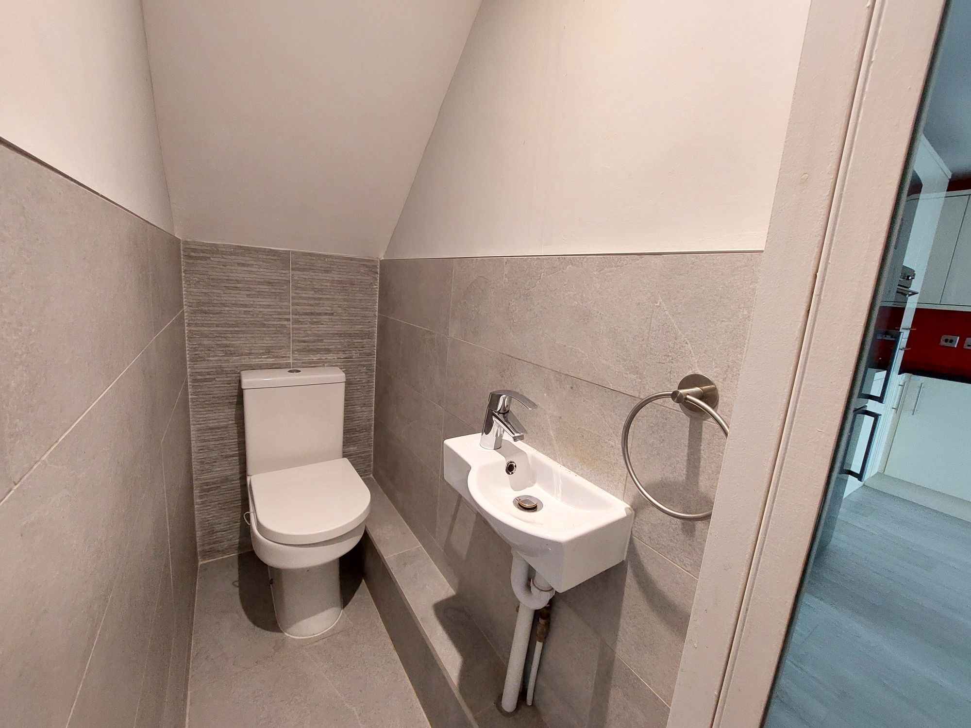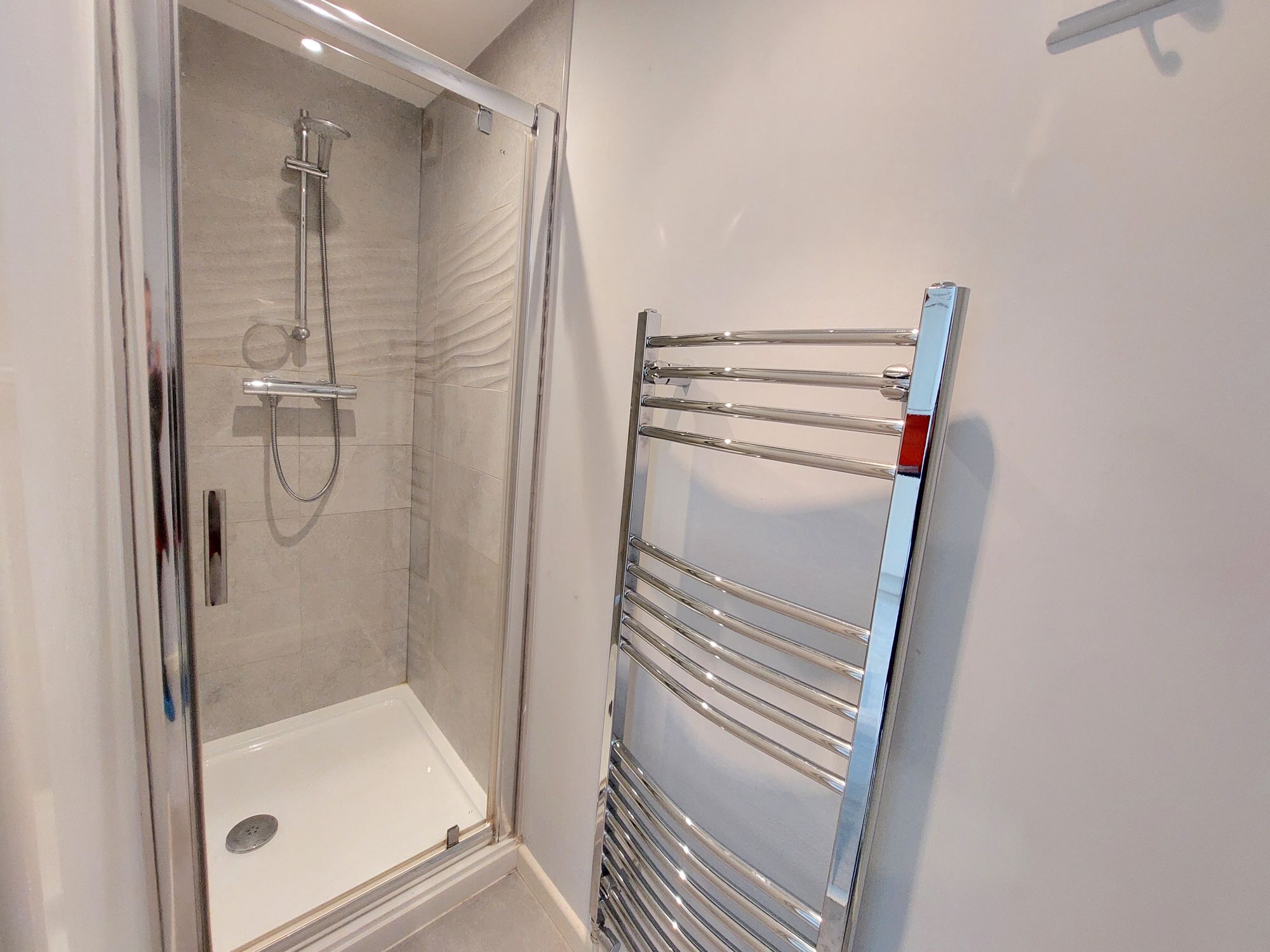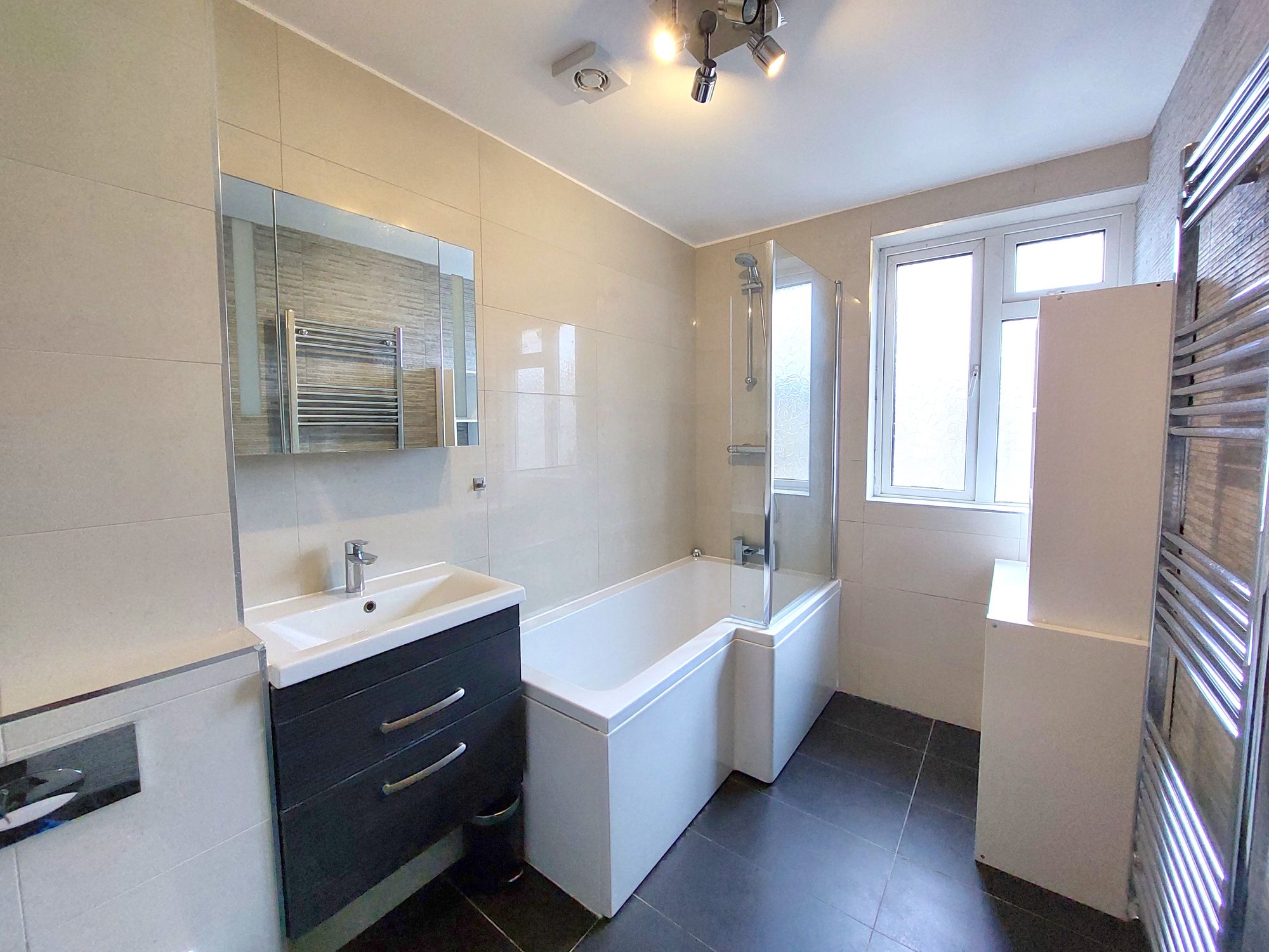 Second floor - A modern bathroom features tiled flooring and walls, a P bath, low level WC, hand wash basin with storage drawers beneath and wall mounted heated towel rail. There are two bedrooms each with built-in storage.
