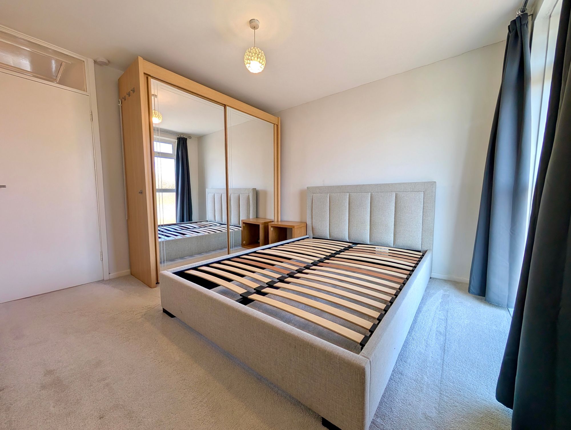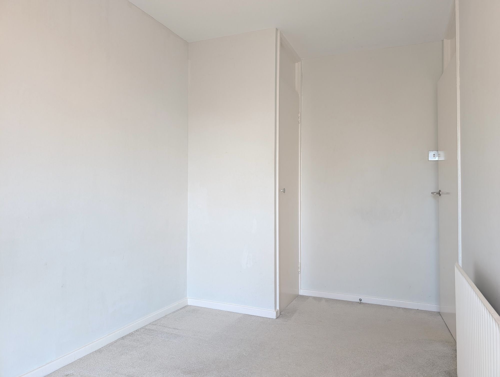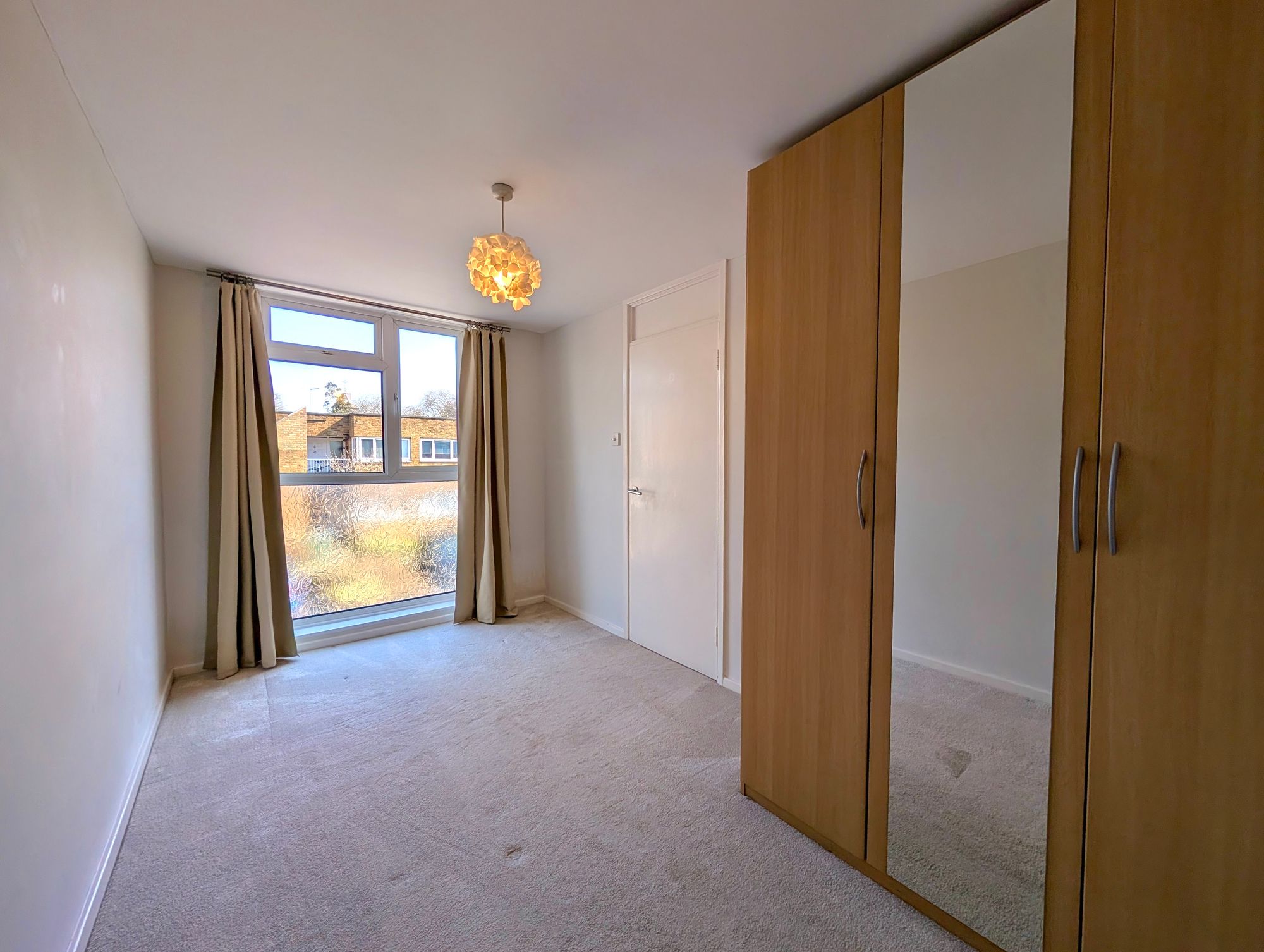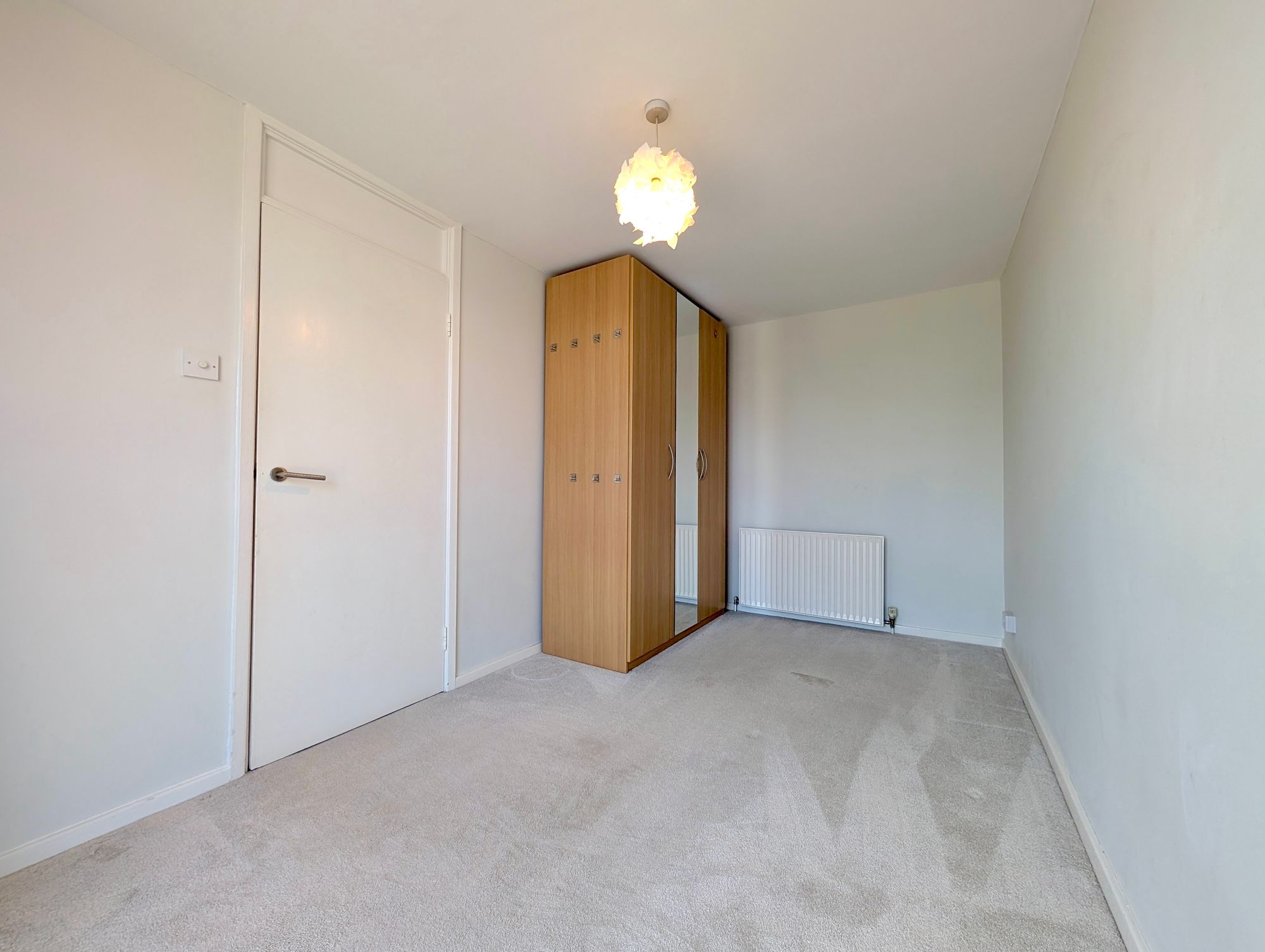 First floor - There are two bedrooms, one with built-in storage and the other with a freestanding wardrobe.